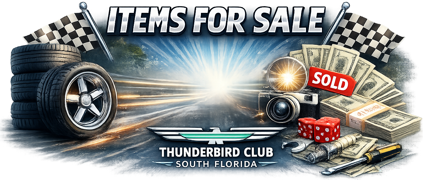 | The Classic Thunderbird Club of South Florida makes no warranty whatsoever in connection with the advertisements listed. All descriptions and representations are made by the seller and are for identification purposes only, they are the sole responsibility of the seller. They are not to be construed as a warranty of any type. It is the responsibility of the buyer to thoroughly inspect the item, and be satisfied as to its condition and value before purchasing. The Classic Thunderbird Club of South Florida assumes no responsibility whatsoever for the items advertised. |